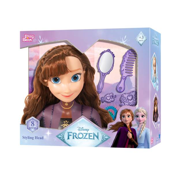 Busto para pentear da personagem Anna de Frozen II, em vinil, cabelos enraizados, roupa pintada, sem mecanismo, acompanha acessórios de beleza de brinquedo, altura 17 cm, idade recomendada 3+.