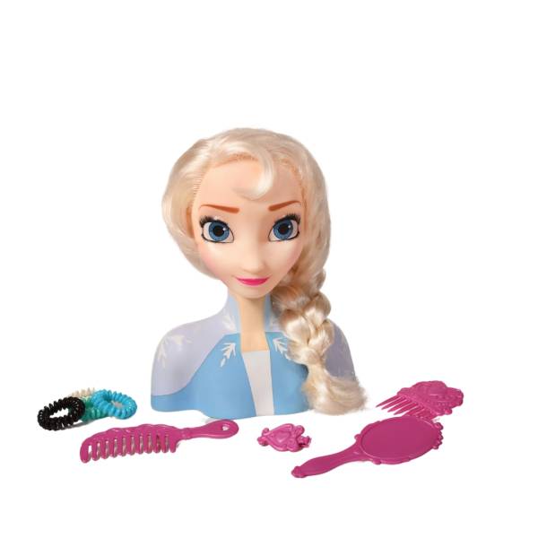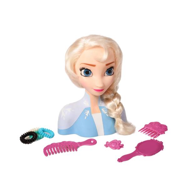 Busto para pentear da personagem Elsa de Frozen II, em vinil, cabelos enraizados, roupa pintada, sem mecanismo, acompanha acessórios de beleza de brinquedo, altura 17 cm, idade recomendada 3+.