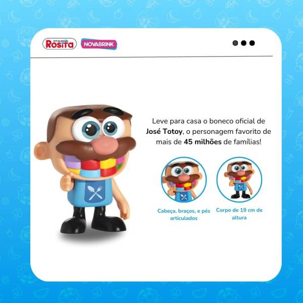 Leve para casa o boneco oficial de José Totoy, o personagem favorito de mais de 45 milhões de famílias! Com 19 cm de altura, feito em vinil de alta qualidade, articulações flexíveis e pintura antialérgica, esse boneco é ideal para crianças a partir de 3 anos.