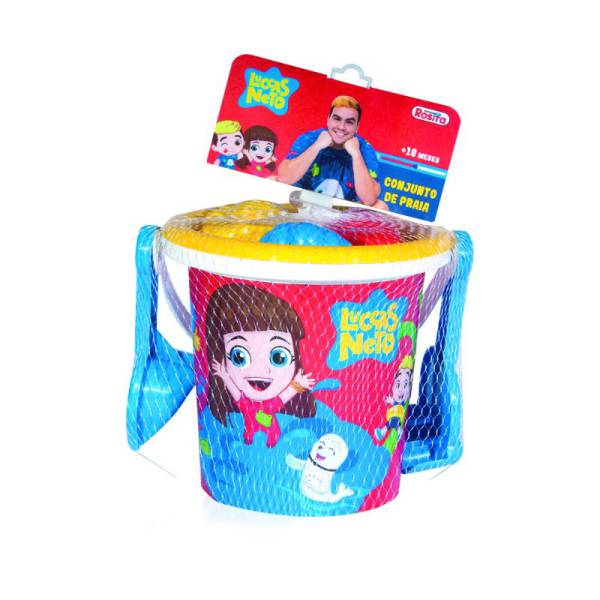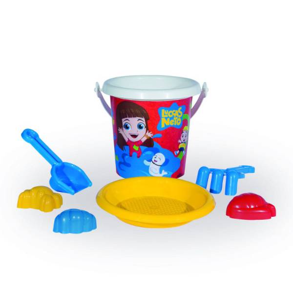 Conjunto de praia injetado, composto por baldinho, peneira, pá, ancinho e 3 forminhas de areia, decorado com imagens da personagem animada da Gi Neto