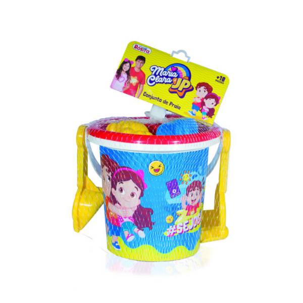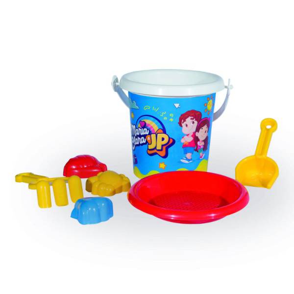 Conjunto de praia injetado, composto por baldinho, peneira, pá, ancinho e 3 forminhas de areia, decorado com imagens dos personagens animados dos Youtubers Maria Clara & JP