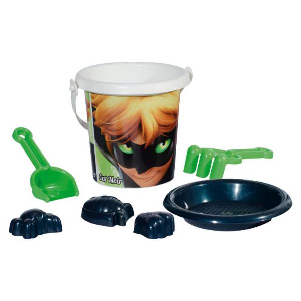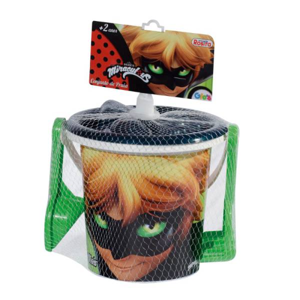 Conjunto de praia injetado, composto por baldinho, peneira, pá, ancinho e 3 forminhas de areia, decorado com imagens do personagem Cat Noir