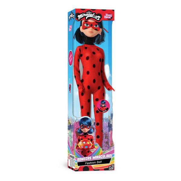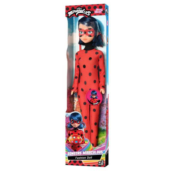 Boneca em vinil da persogem Ladybug de Miraculous Aventuras de Ladybug, versão Fashion Doll, roupa em tecido 100% poliester, cabelos enraizados, máscara na face pintada, pernas, braços e cabeça articulados, altura 30 cm, sem mecanismo, idade recomendada 3+.