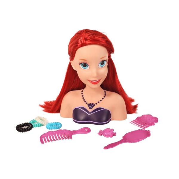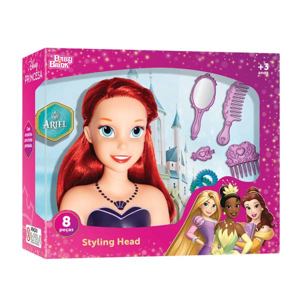 Busto para pentear da Princesa Ariel da Disney, em vinil, cabelos enraizados, roupa pintada, sem mecanismo, acompanha acessórios de beleza de brinquedo, altura 24 cm, idade recomendada 3+.