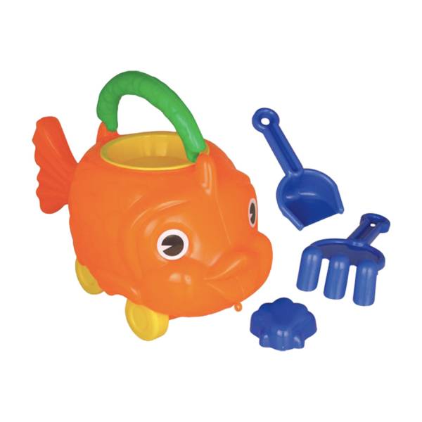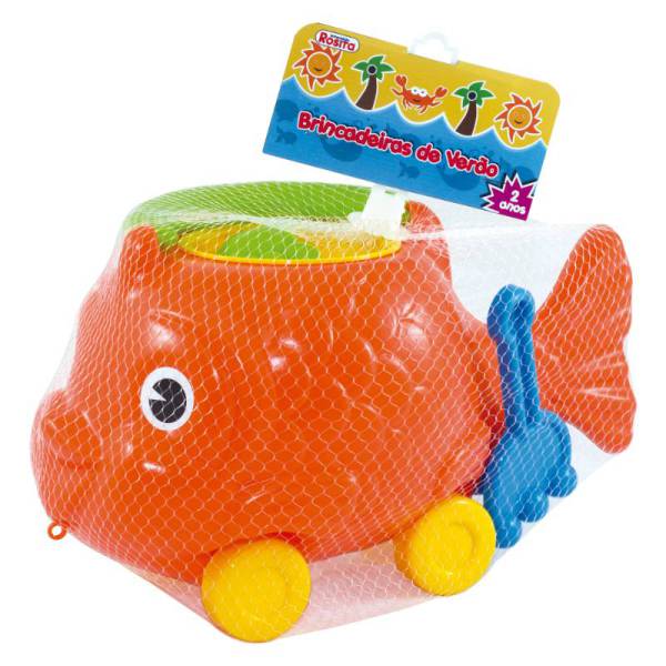 O clássico baldinho da Rosita em formato de peixe, com rodinhas, acompanham peneira, pá, ancinho e forminhas de areia