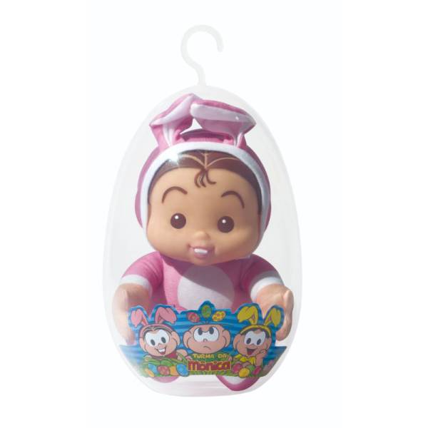 Boneca da personagem Mônica da Turma da Mônica, versão Coelhinho no Ovo de Páscoa, cabeça em vinil, corpo macio em tecido 100% poliéster e enchimento 100% poliéster reciclado, altura 24 cm, sem mecanismo, idade recomendada 2 meses+