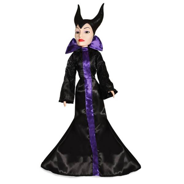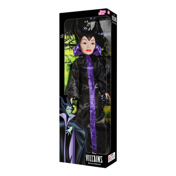 Boneca da personagem Malévola das Vilâs Disney, em vinil, cabelos enraizados, luxuosa roupa em tecido, braços, pernas e cabeça articulados, sapatos removíveis, sem mecanismo, altura 57 cm, idade recomendada 3+