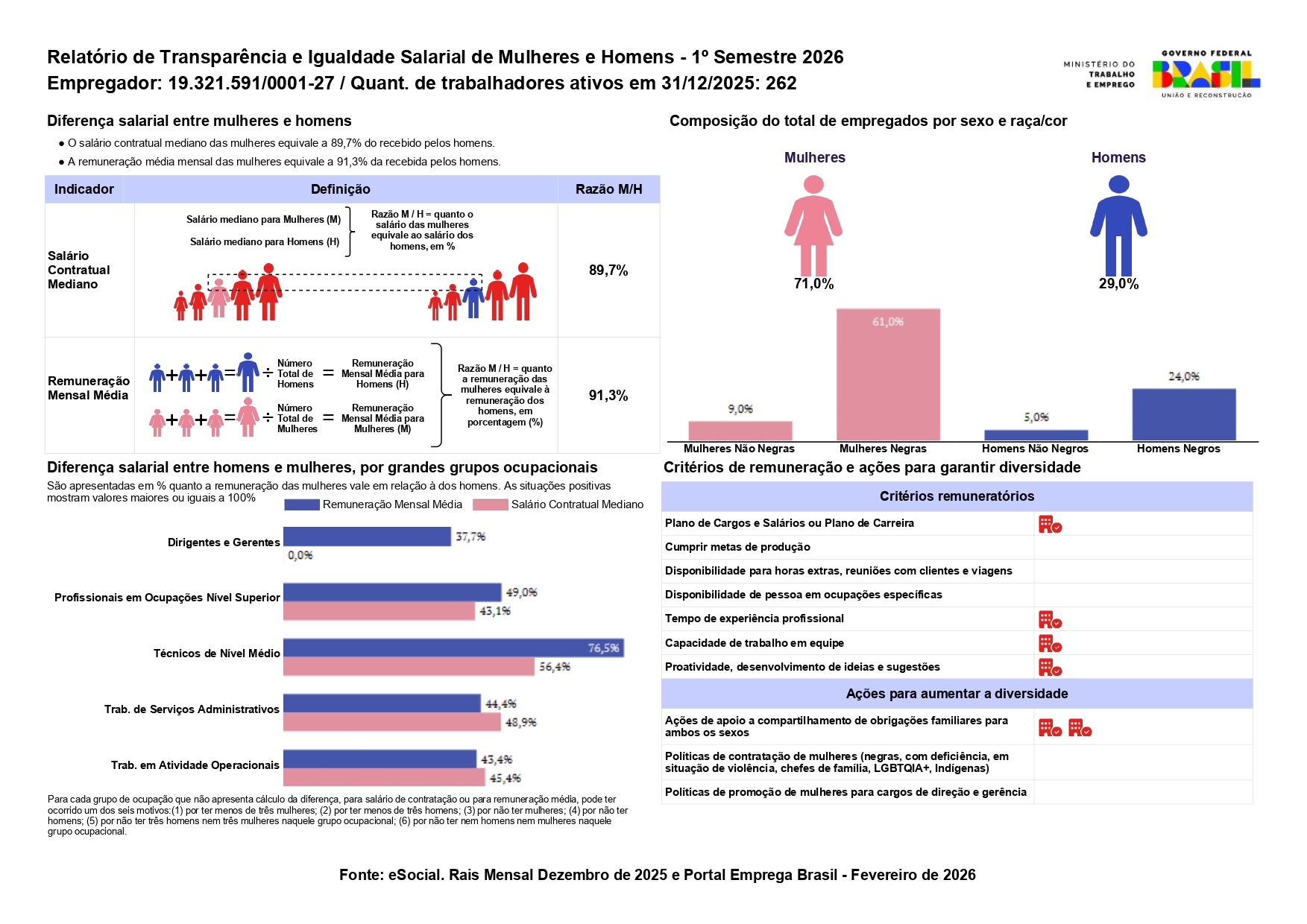 Em conformidade com a Lei nº 14.611/2023, o Decreto nº 11.795 e a Portaria MTE nº 3.714, divulgamos o nosso Relatório de Transparência Salarial e de Critérios Remuneratórios – 1º semestre de 2026.