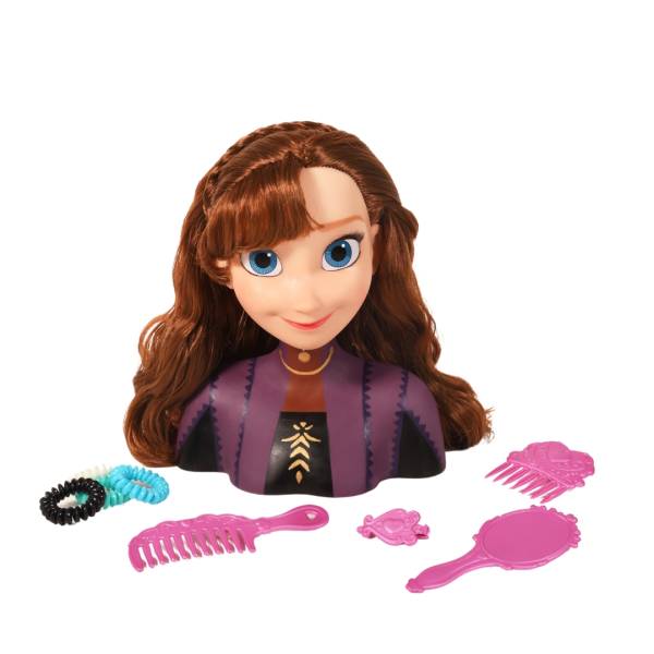 Busto para pentear da personagem Anna de Frozen II, em vinil, cabelos enraizados, roupa pintada, sem mecanismo, acompanha acessórios de beleza de brinquedo, altura 17 cm, idade recomendada 3+.