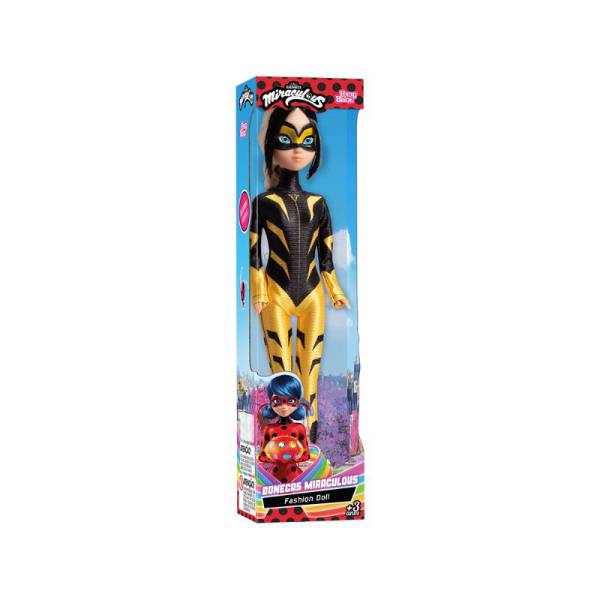 Boneca em vinil da persogem Vesperia de Miraculous Aventuras de Ladybug, versão Fashion Doll, roupa em tecido 100% poliester, cabelos enraizados, máscara na face pintada, pernas, braços e cabeça articulados, altura 30 cm, sem mecanismo, idade recomendada 3+.
