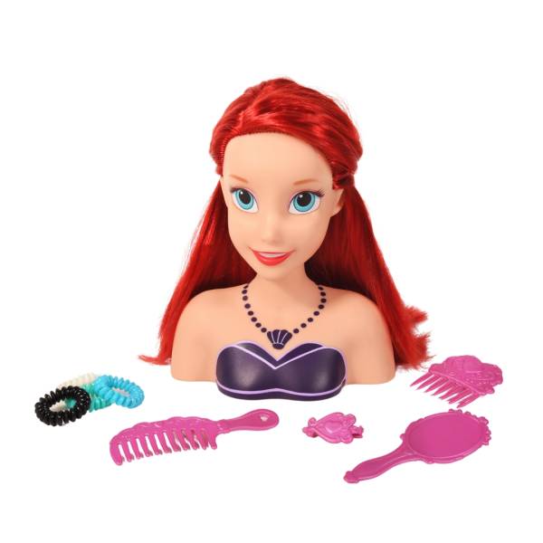 Busto para pentear da Princesa Ariel da Disney, em vinil, cabelos enraizados, roupa pintada, sem mecanismo, acompanha acessórios de beleza de brinquedo, altura 24 cm, idade recomendada 3+.
