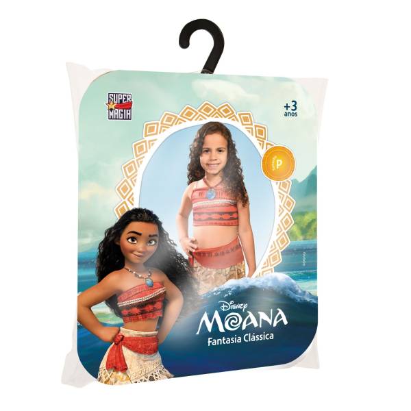 fantasia da personagem Moana, uma das Princesas Disney, na versão clássica , duas peças com saia curta, top e faixa na cintura, em luxuoso tecido 100% poliéster, disponível nos tamanhos P, M e G (3 a 5 anos, 6 a 8 anos e 9 a 12 anos recpectivamente).