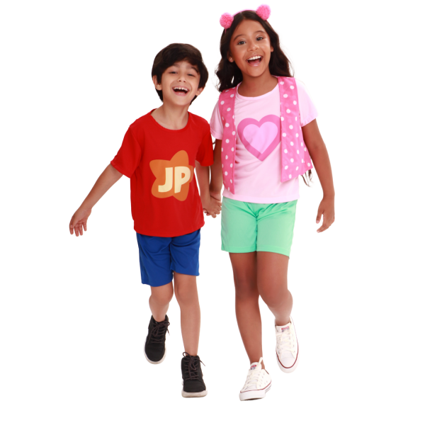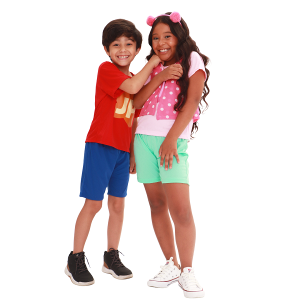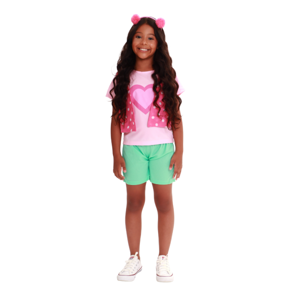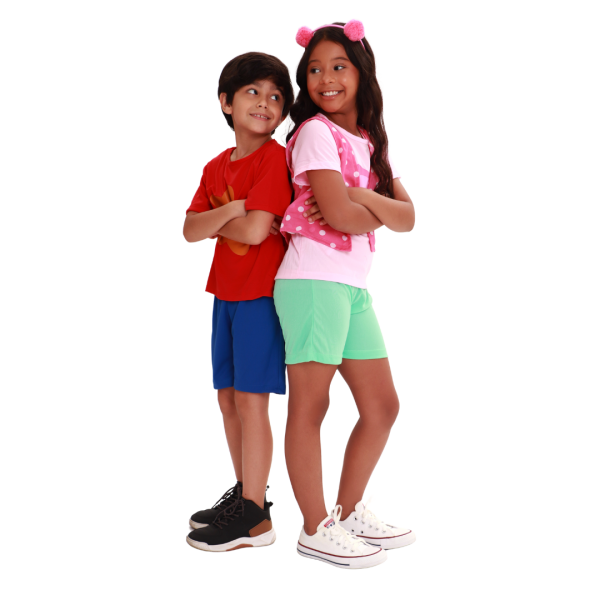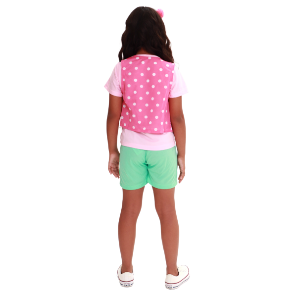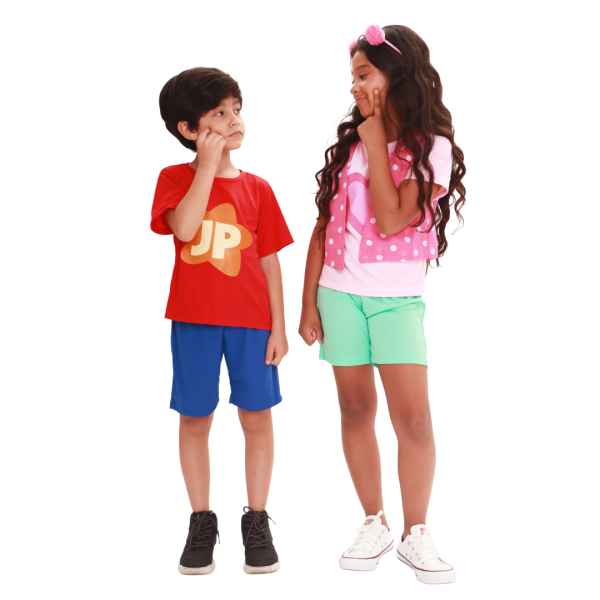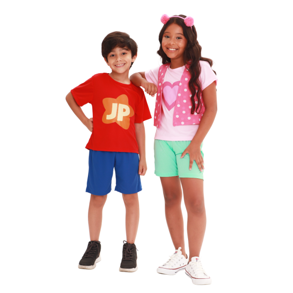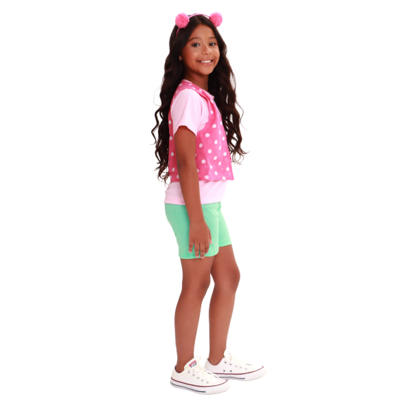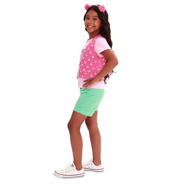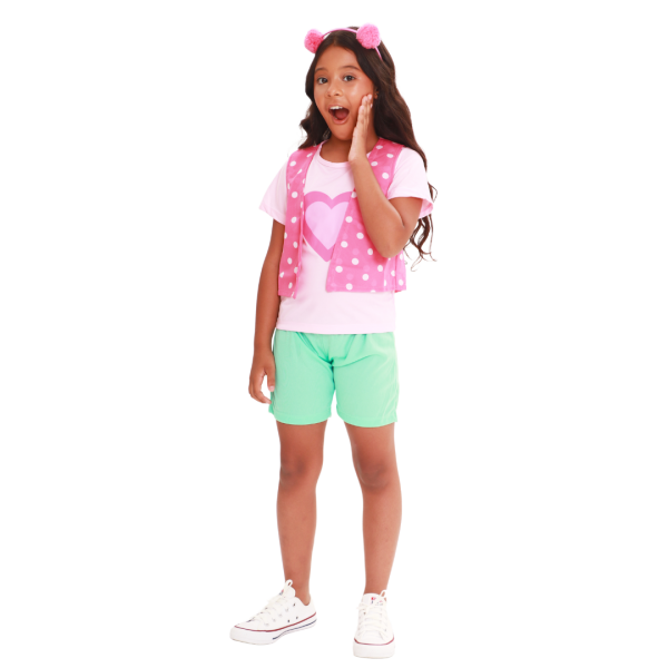 Fantasia da personagem Maria Clara, da dupla de youtubers de sucesso Maria Clara & JP, bermuda e camiseta de mangas curtas, em tecido 100% poliéster, acompanham colete e pompom de cabeça, disponível nos tamanhos P, M e G (3 a 5 anos, 6 a 8 anos e 9 a 12 anos recpectivamente).
