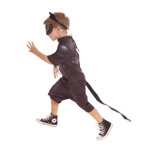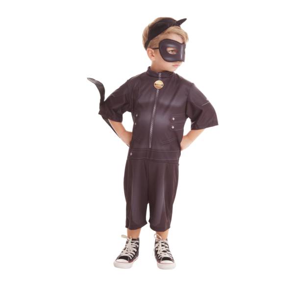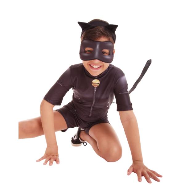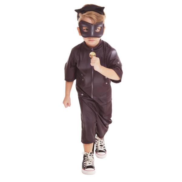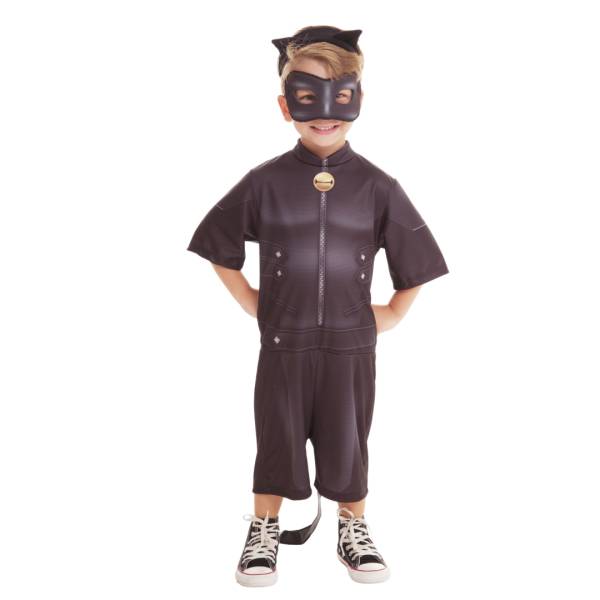 Fantasia do personagem Cat Noir, das Aventuras Miraculous Ladybug, versão básica, macacão de pernas e mangas curtas em tecido 100% poliéster, acompanha máscara em espuma anti chamas, disponível nos tamanhos P, M e G (3 a 5 anos, 6 a 8 anos e 9 a 12 anos recpectivamente).