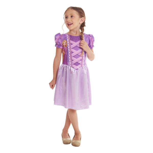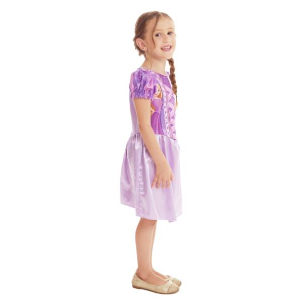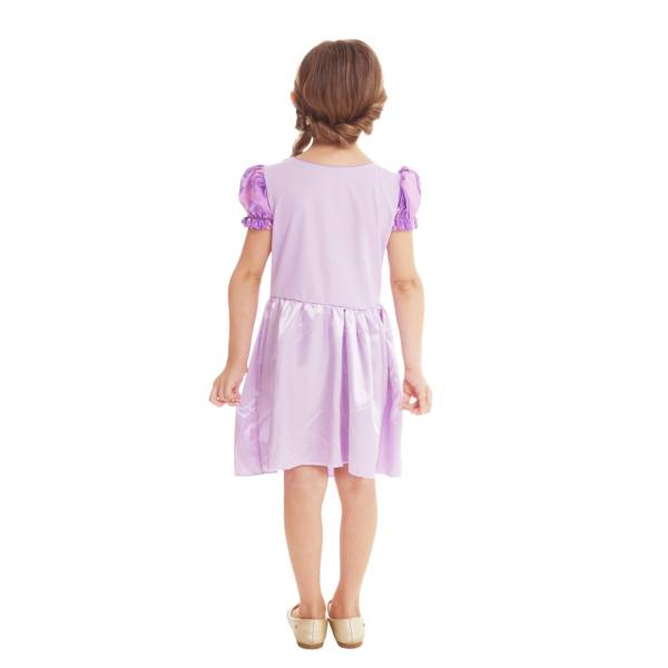 Fantasia da personagem Rapunzel, uma das Princesas Disney, na versão básica, vestido curto, mangas curtas, em tecido 100% poliéster, disponível nos tamanhos P, M e G (3 a 5 anos, 6 a 8 anos e 9 a 12 anos recpectivamente).
