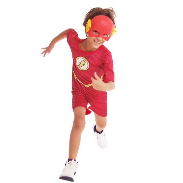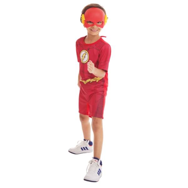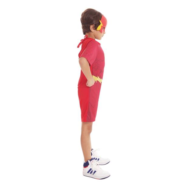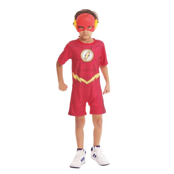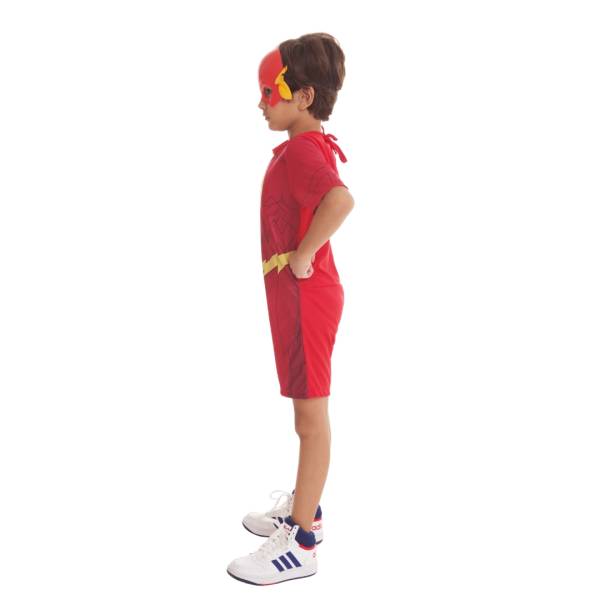 Fantasia do personagem Flash da Warner DC, macacão de pernas curtas em tecido 100% poliéster, acompanha máscara injetada, disponível nos tamanhos P, M e G (3 a 5 anos, 6 a 8 anos e 9 a 12 anos recpectivamente).