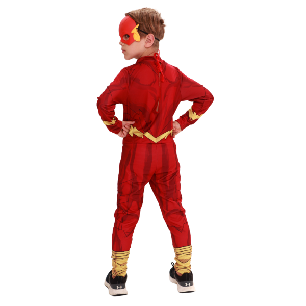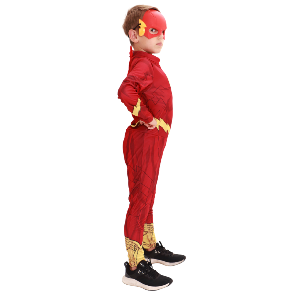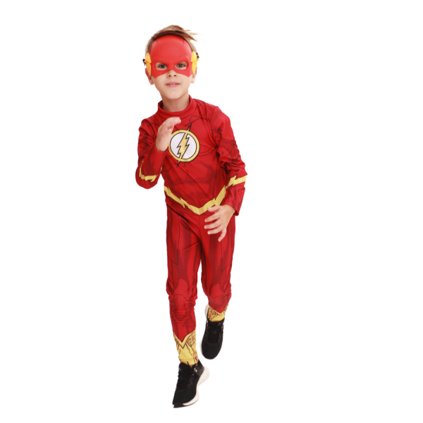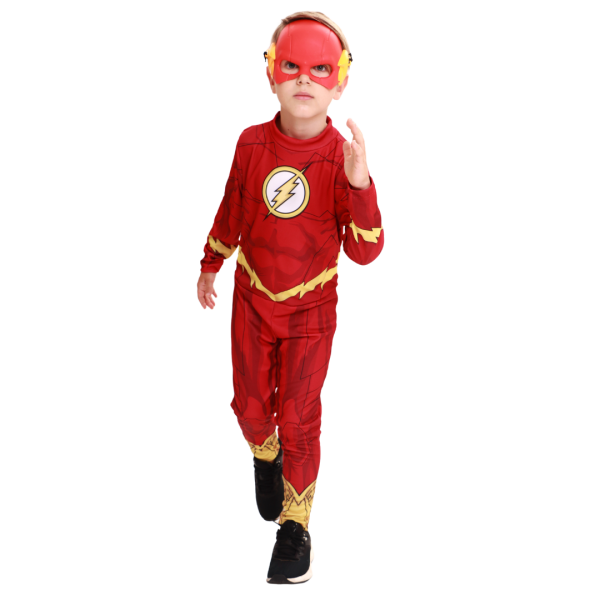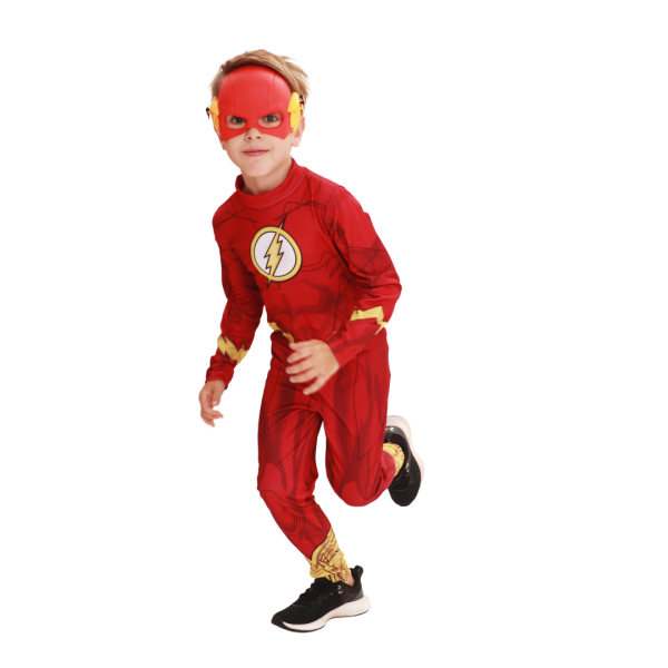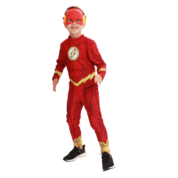 Fantasia do personagem Flash da Warner DC, macacão de pernas longas em tecido 100% poliéster, acompanha máscara injetada, disponível nos tamanhos P, M e G (3 a 5 anos, 6 a 8 anos e 9 a 12 anos recpectivamente).