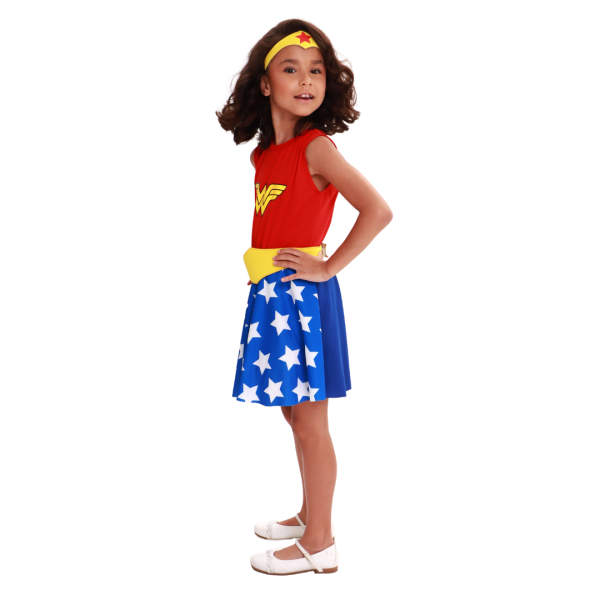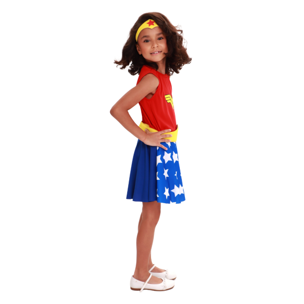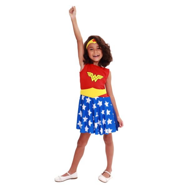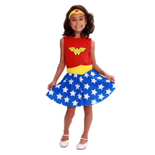 Fantasia da personagem Mulher Maravilha da Warner DC, vestido curto em tecido 100% poliéster, acompanha faixa para cabeça e cinturão, disponível nos tamanhos P, M e G (3 a 5 anos, 6 a 8 anos e 9 a 12 anos recpectivamente).