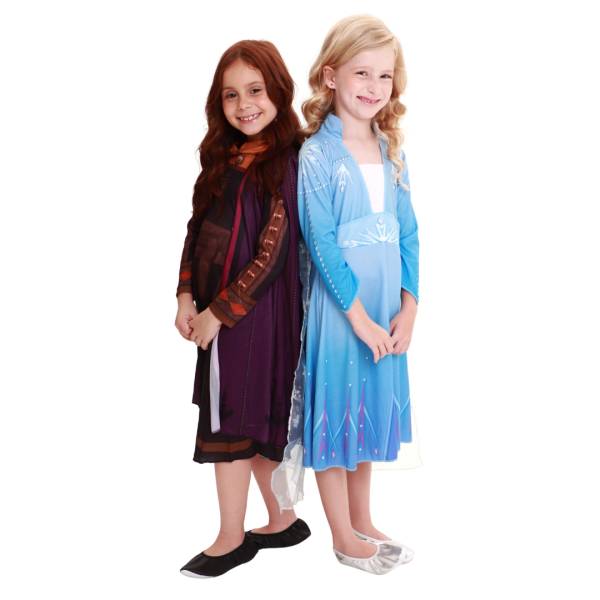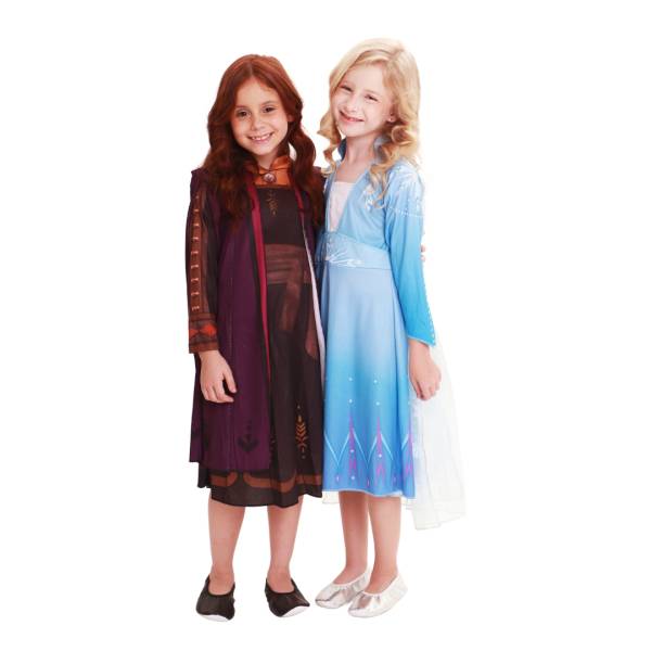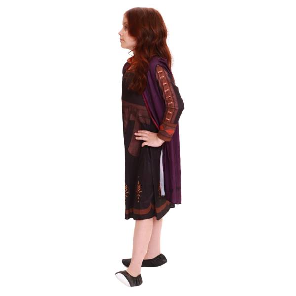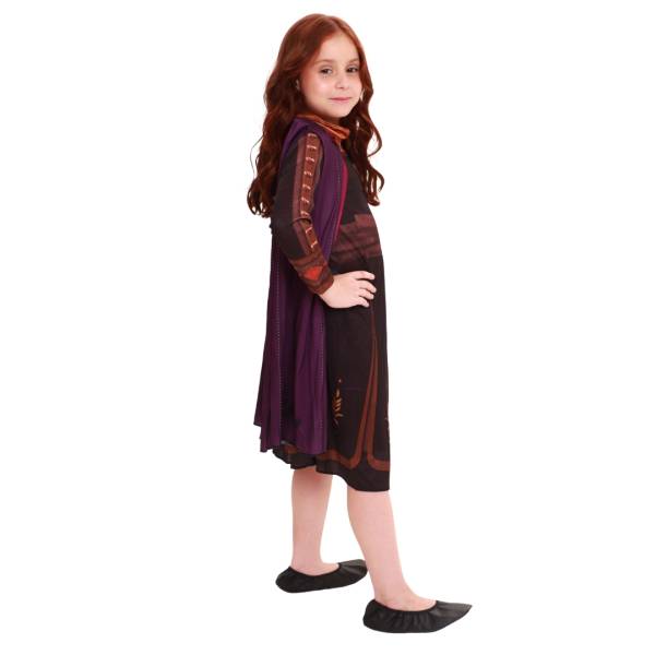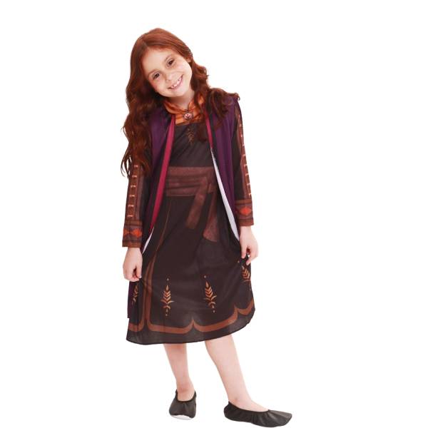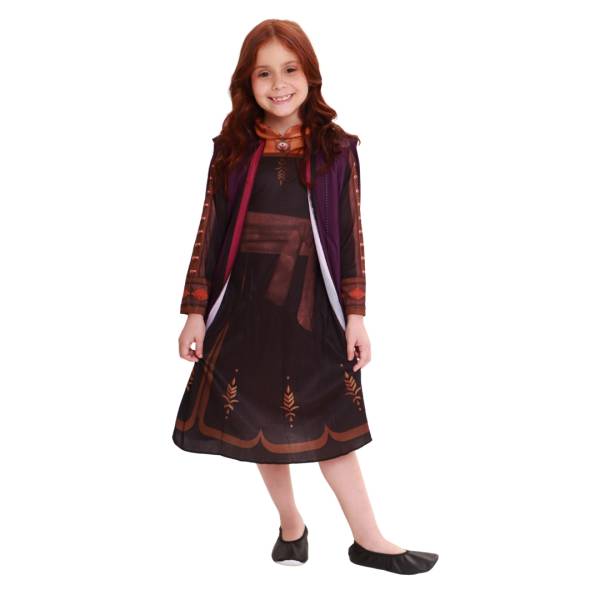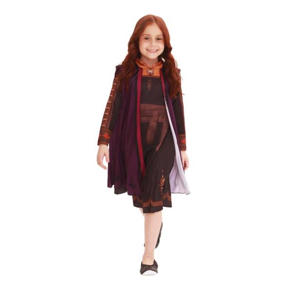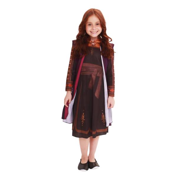 fantasia da personagem Anna, uma das Princesas Disney do filme Frozen, na versão clássica , vestido curto, mangas longas e capa em luxuoso tecido 100% poliéster, disponível nos tamanhos P, M e G (3 a 5 anos, 6 a 8 anos e 9 a 12 anos recpectivamente).