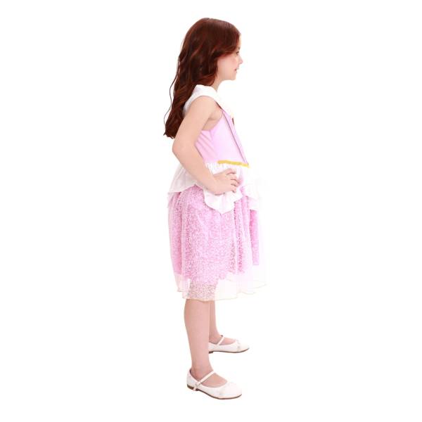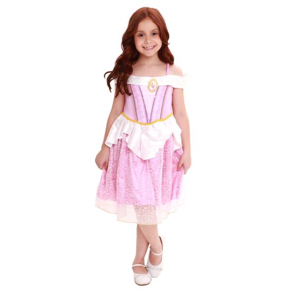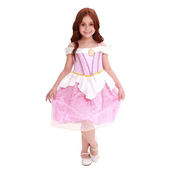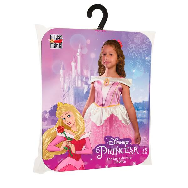 fantasia da personagem Aurora, uma das Princesas Disney, na versão clássica , vestido curto, mangas curtas, em luxuoso tecido 100% poliéster, disponível nos tamanhos P, M e G (3 a 5 anos, 6 a 8 anos e 9 a 12 anos recpectivamente).