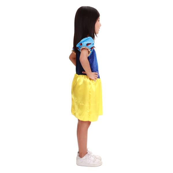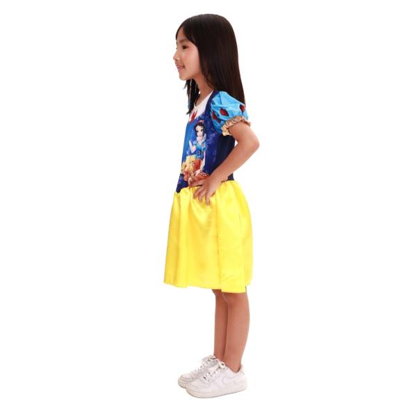 Fantasia da personagem Branca de Neve, uma das Princesas Disney, na versão básica, vestido curto, mangas curtas, em luxuoso tecido 100% poliéster, detalhes em transfer, disponível nos tamanhos P, M e G (3 a 5 anos, 6 a 8 anos e 9 a 12 anos recpectivamente).