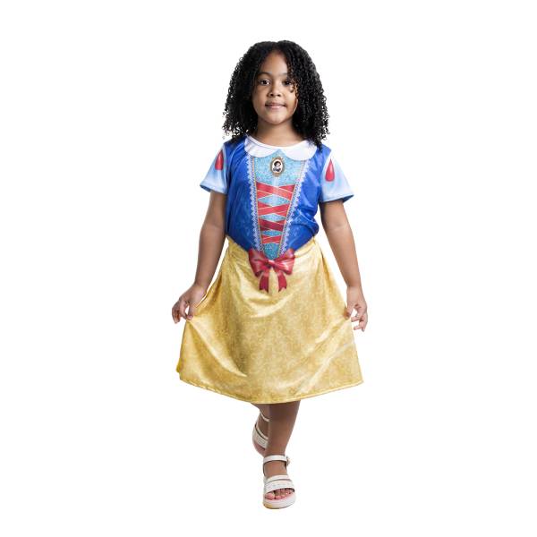 Fantasia da personagem Branca de Neve, uma das Princesas Disney, na versão pop, vestido curto, mangas curtas, disponível nos tamanhos P, M e G (3 a 5 anos, 6 a 8 anos e 9 a 12 anos recpectivamente).