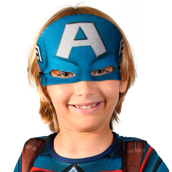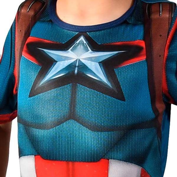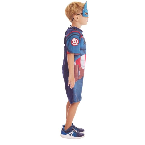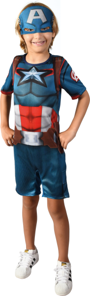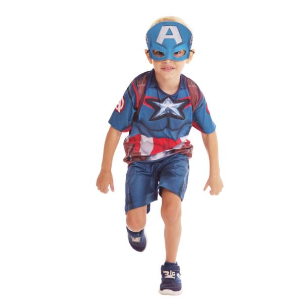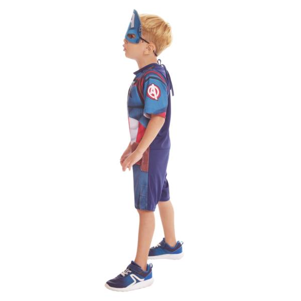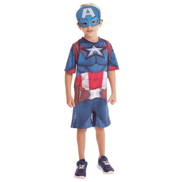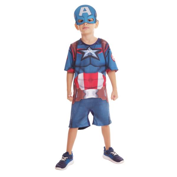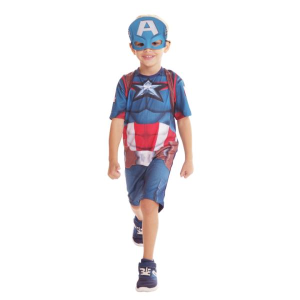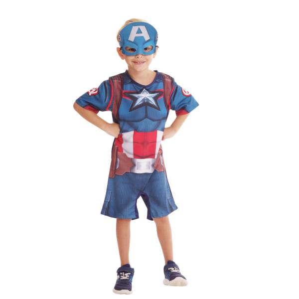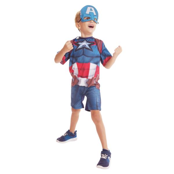 Fantasia do Super Herói Avengers Capitão América, personagem da Marvel, versão básica, macacão curto, acompanha máscara, disponível nos tamanhos P, M e G (3 a 5 anos, 6 a 8 anos e 9 a 12 anos recpectivamente).