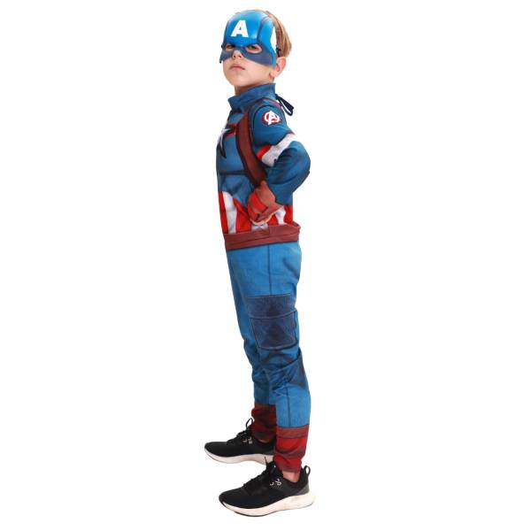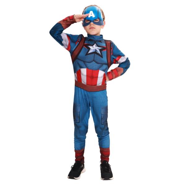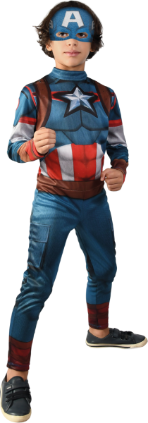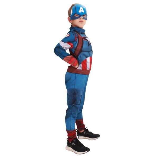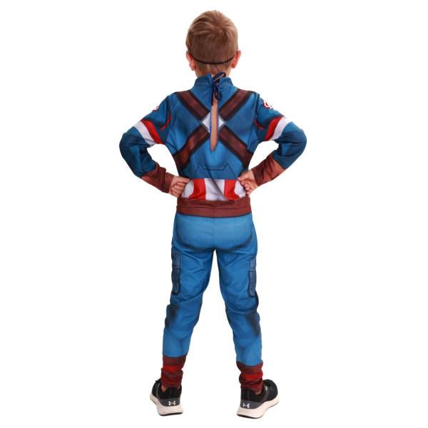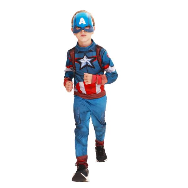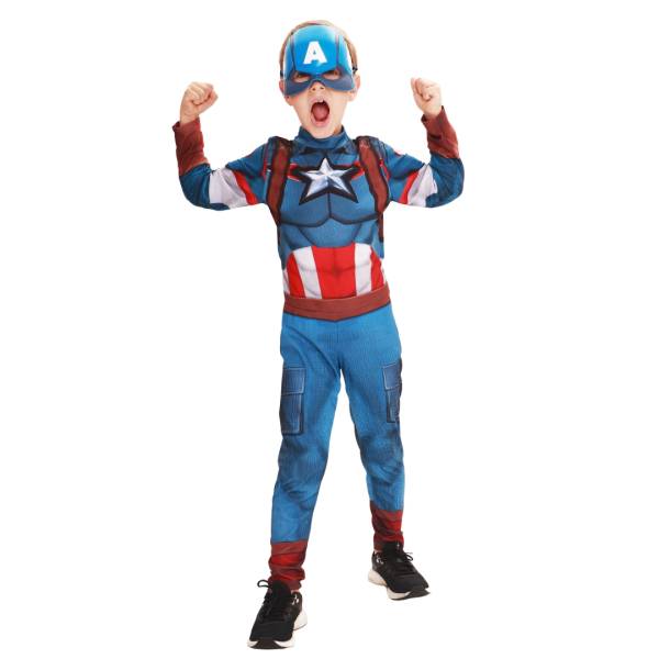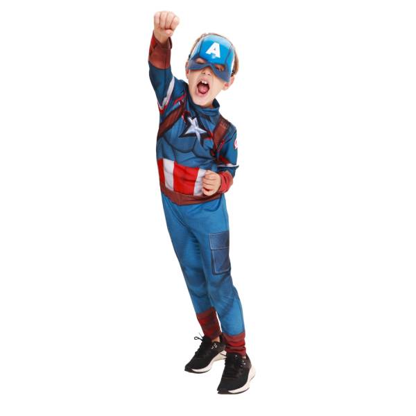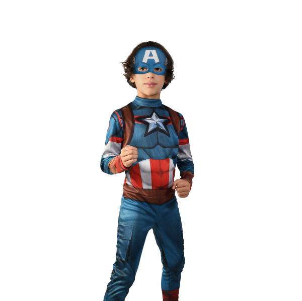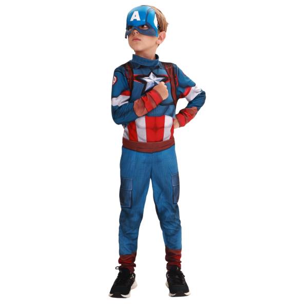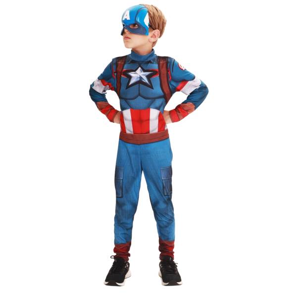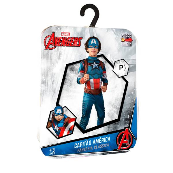 fantasia do Super Herói Avengers Capitão América, personagem da Marvel, versão clássica, macacão de pernas e mangas longas em tecido 100% poliéster, acompanha máscara em EVA, disponível nos tamanhos P, M e G (3 a 5 anos, 6 a 8 anos e 9 a 12 anos recpectivamente).