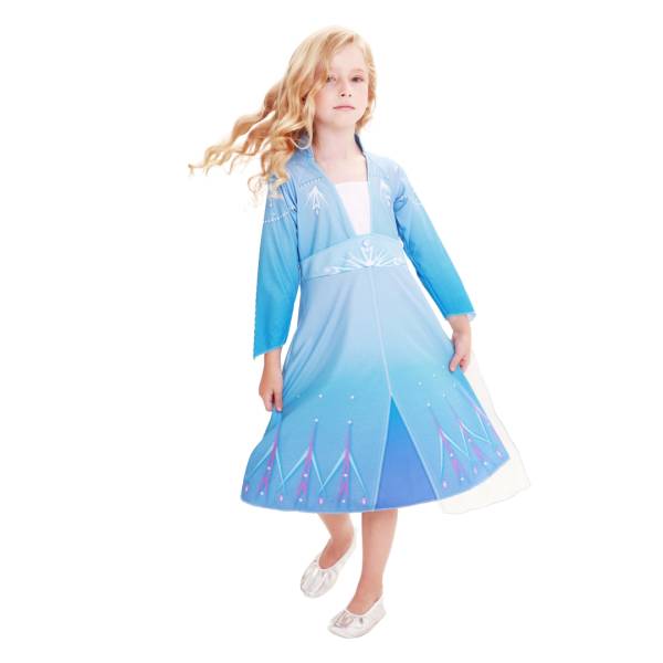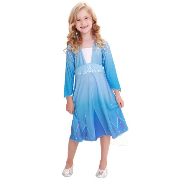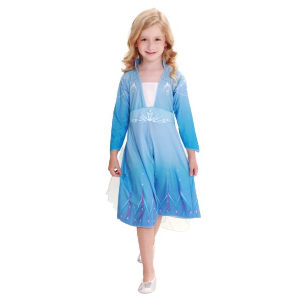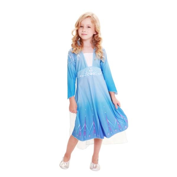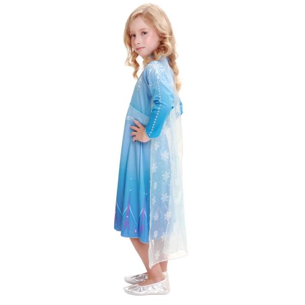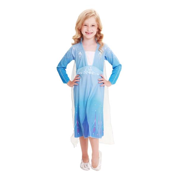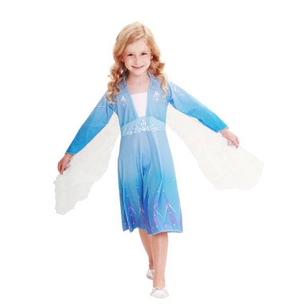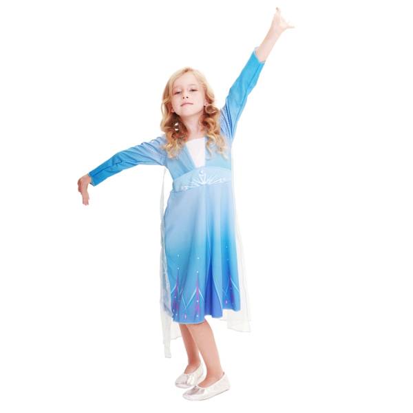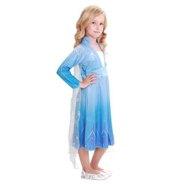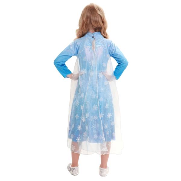 fantasia da personagem Elsa, uma das Princesas Disney do filme Frozen, na versão clássica , vestido curto, mangas longas e capa em luxuoso tecido 100% poliéster, disponível nos tamanhos P, M e G (3 a 5 anos, 6 a 8 anos e 9 a 12 anos recpectivamente).