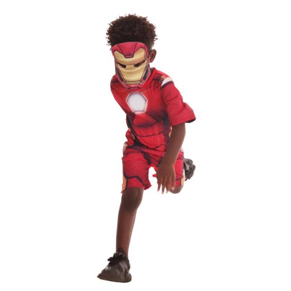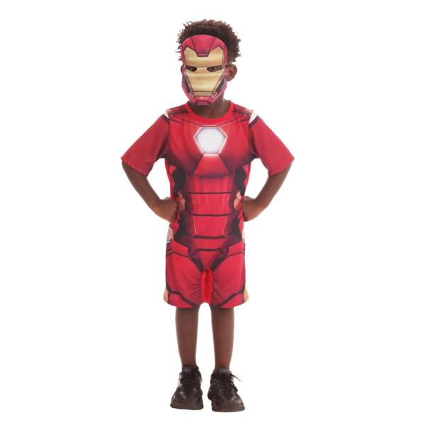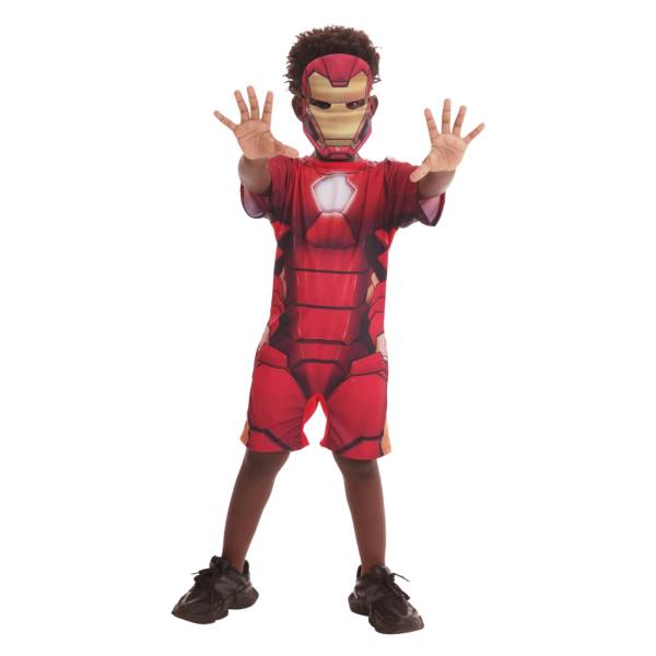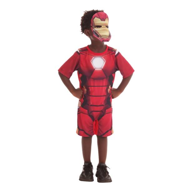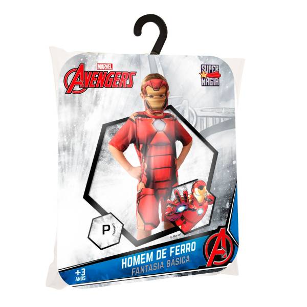Fantasia do Super Herói Avengers Homem de Ferro, personagem da Marvel, versão básica, macacão curtos em tecido 100% poliéster, acompanha máscara em espuma anti chamas, disponível nos tamanhos P, M e G (3 a 5 anos, 6 a 8 anos e 9 a 12 anos recpectivamente).