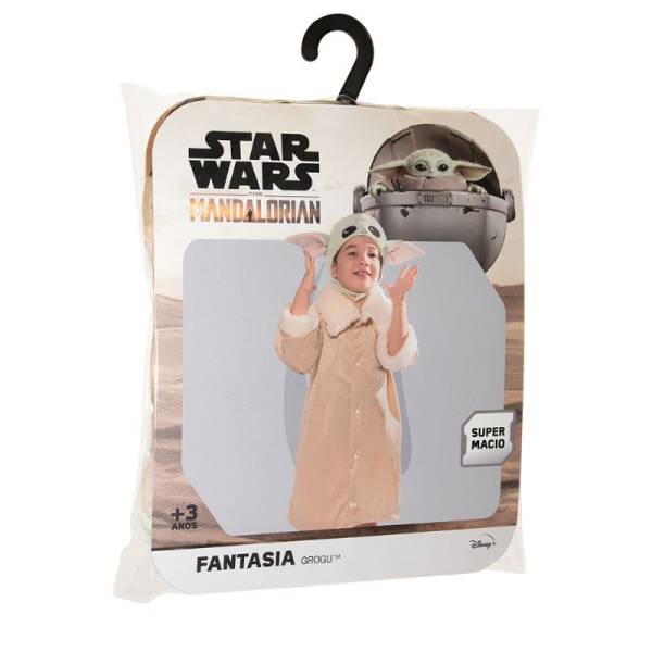 Fantasia do personagem Baby Yoda, versão luxo, capa em tecido 100% poliéster, acompanha touca do personagem, disponível nos tamanhos PP e P.