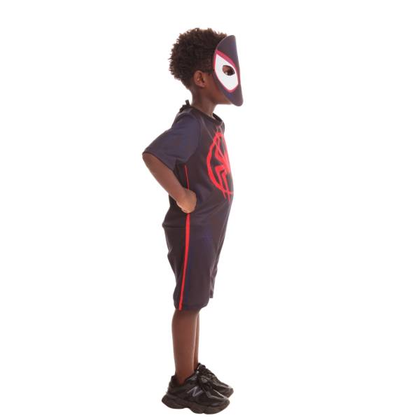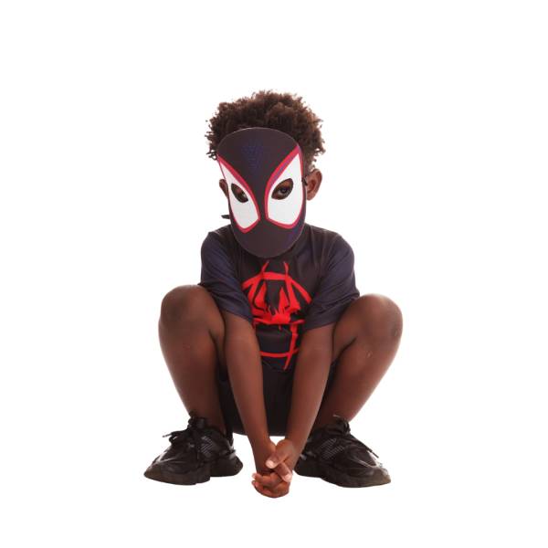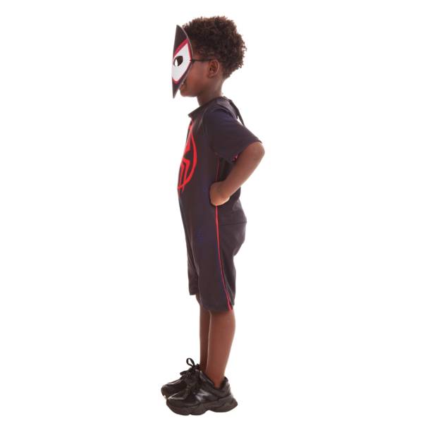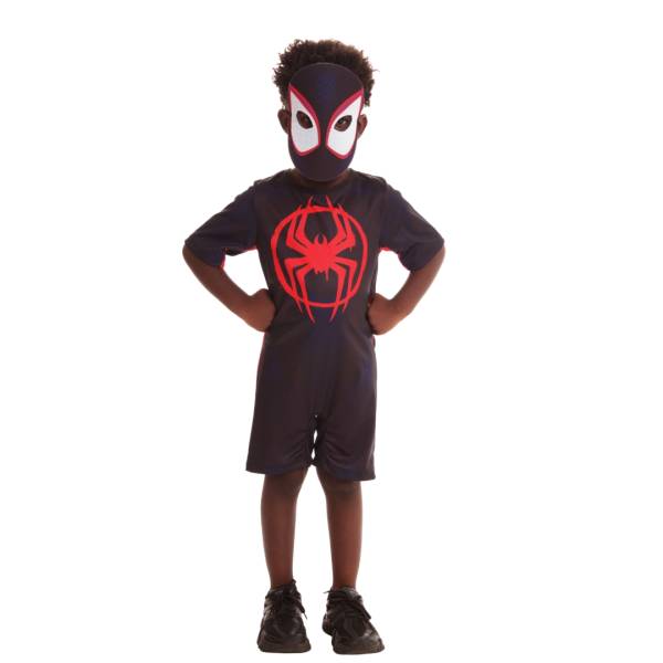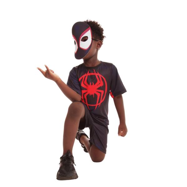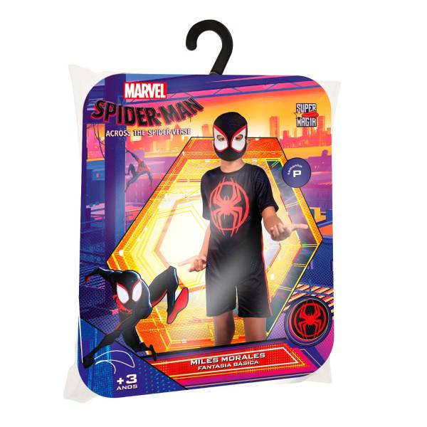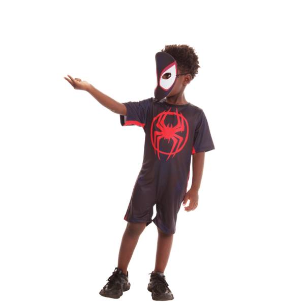 Fantasia do personagem Miles Morales de Spider Man Across The Spider Verse, da Marvel, versão básica, macacão de pernas e mangas curtas em tecido 100% poliéster, acompanha máscara em espuma anti chamas, disponível nos tamanhos P, M e G (3 a 5 anos, 6 a 8 anos e 9 a 12 anos recpectivamente).