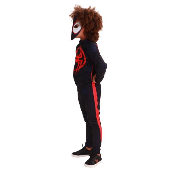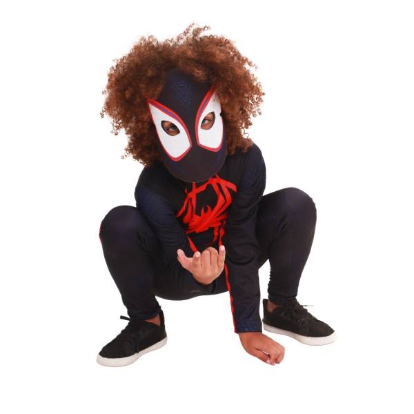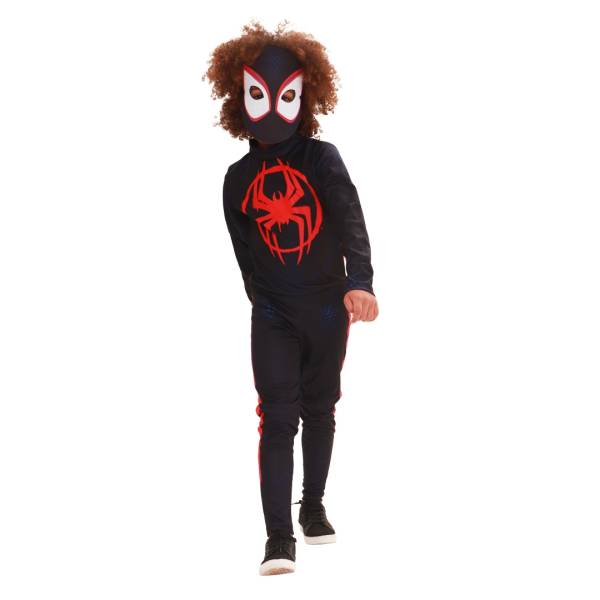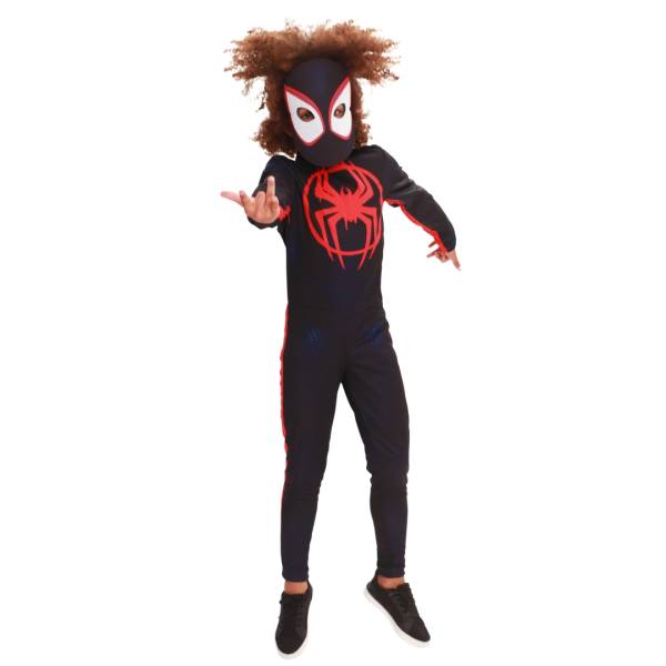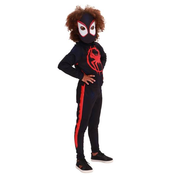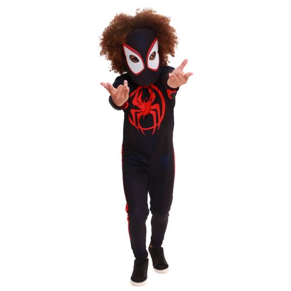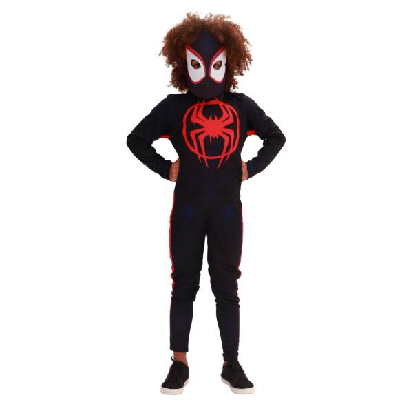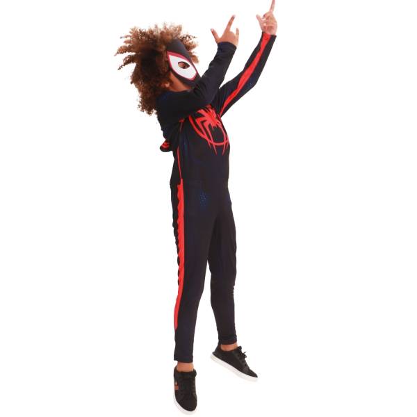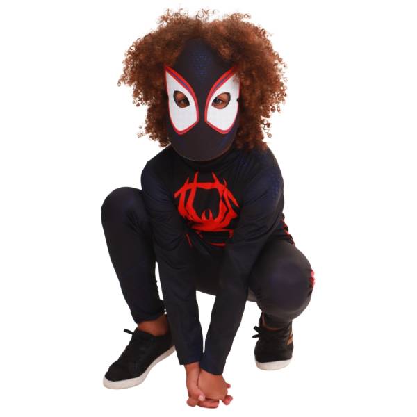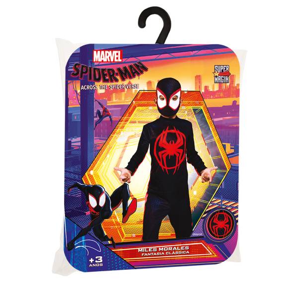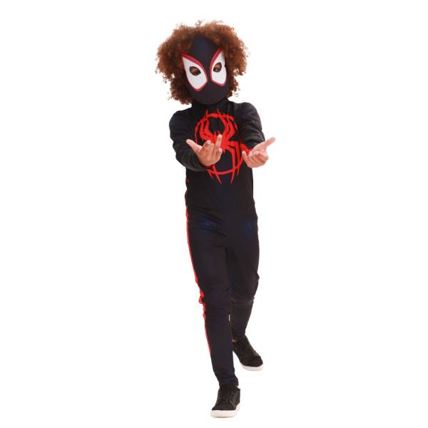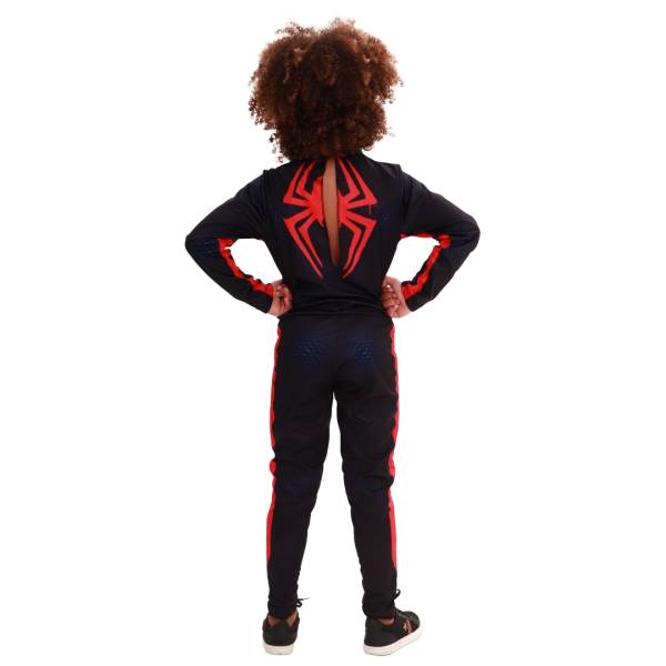 Fantasia do personagem Miles Morales de Spider Man Across The Spider Verse, da Marvel, versão clássica, macacão de pernas e mangas longas em tecido 100% poliéster, acompanha máscara em espuma anti chamas, disponível nos tamanhos P, M e G (3 a 5 anos, 6 a 8 anos e 9 a 12 anos recpectivamente).