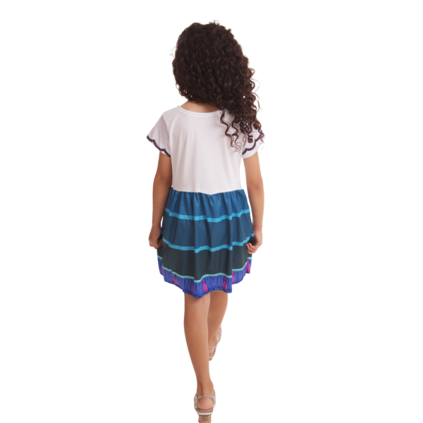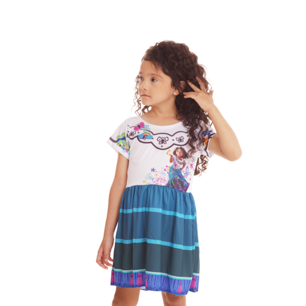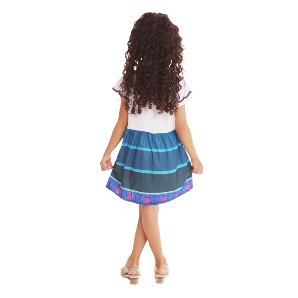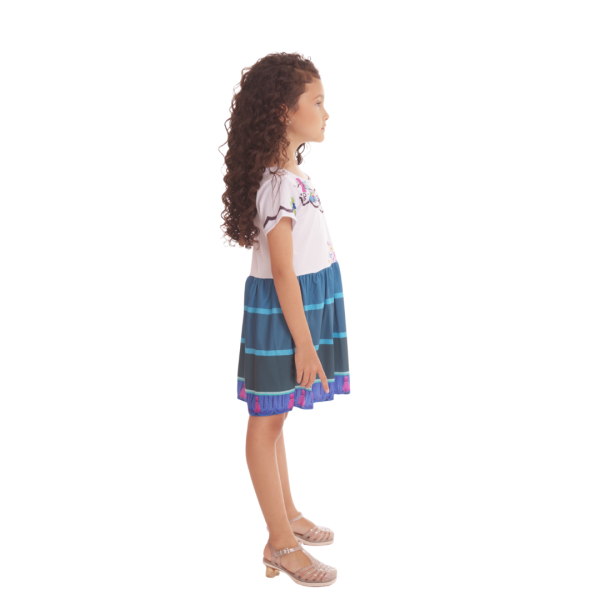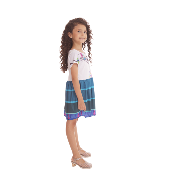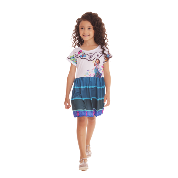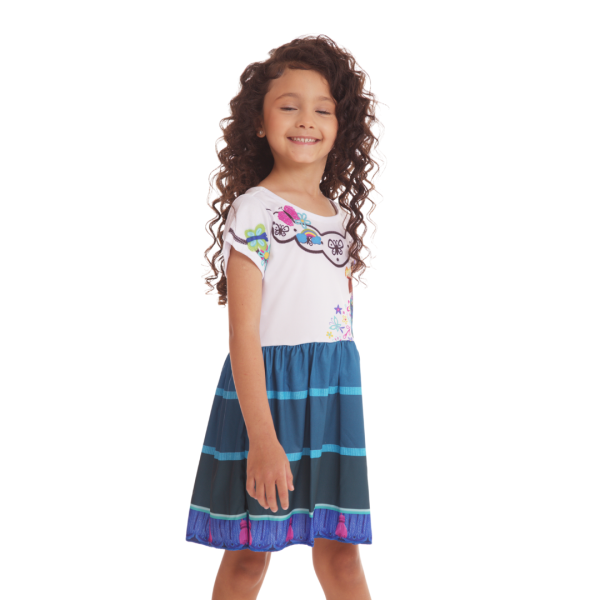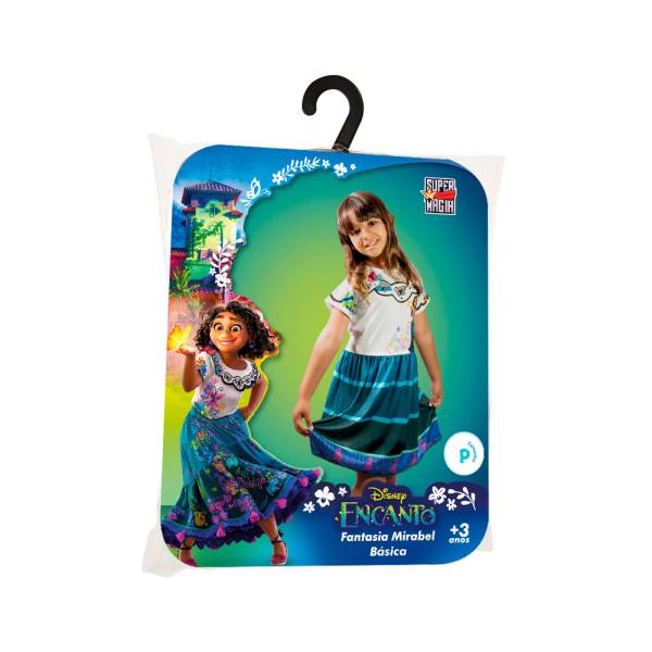 Fantasia da personagem Mirabel do filme Disney Encanto , versão básica, vestido curto, mangas curtas, em tecido 100% poliéster, detalhes em transfer, disponível nos tamanhos P, M e G (3 a 5 anos, 6 a 8 anos e 9 a 12 anos recpectivamente).