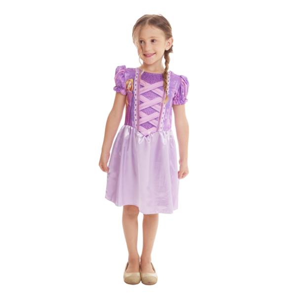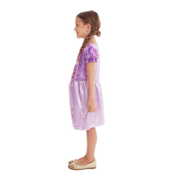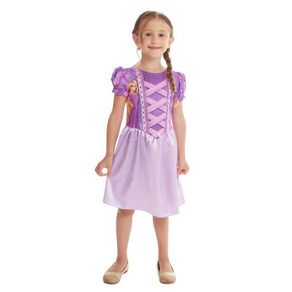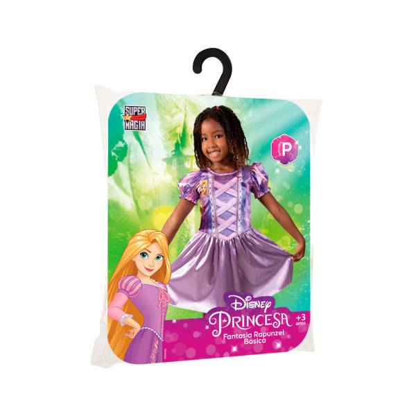 Fantasia da personagem Rapunzel, uma das Princesas Disney, na versão básica, vestido curto, mangas curtas, em tecido 100% poliéster, disponível nos tamanhos P, M e G (3 a 5 anos, 6 a 8 anos e 9 a 12 anos recpectivamente).