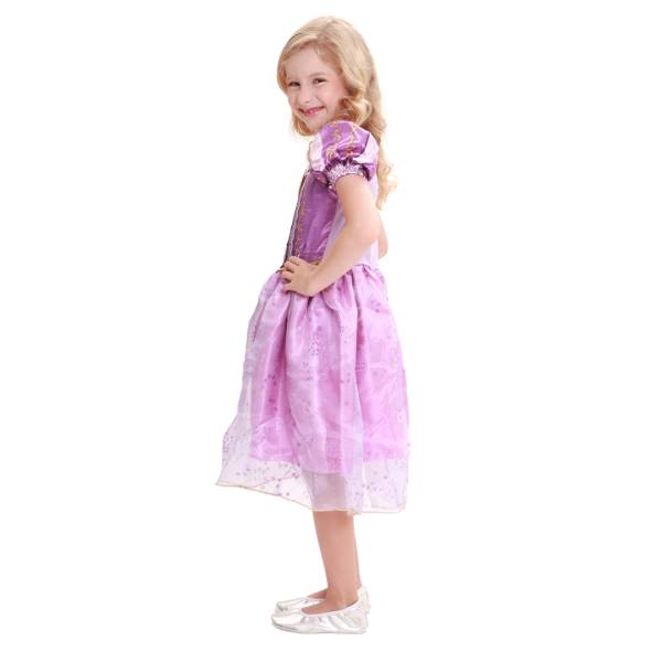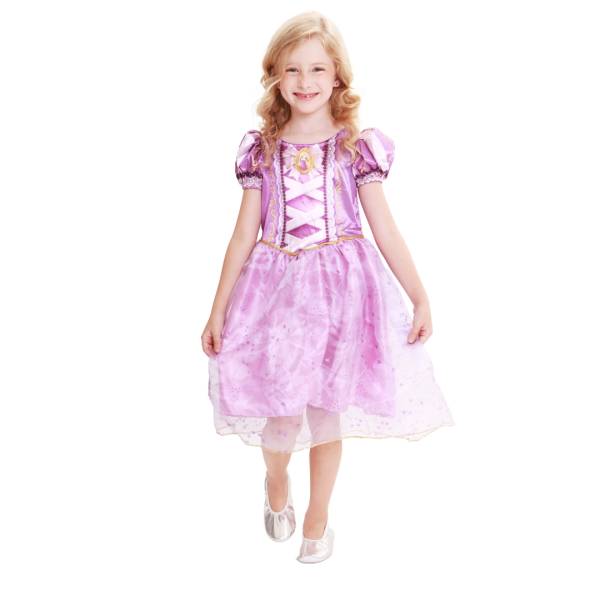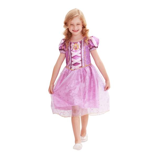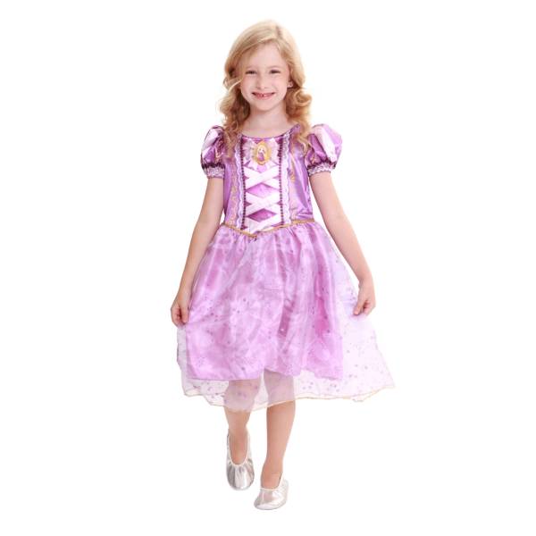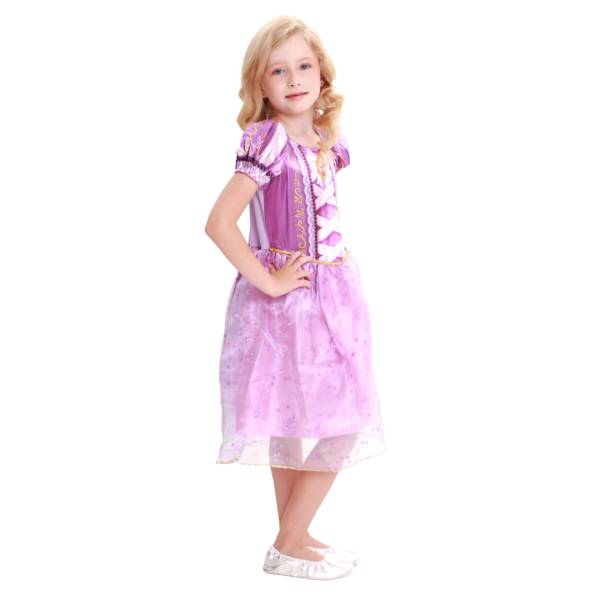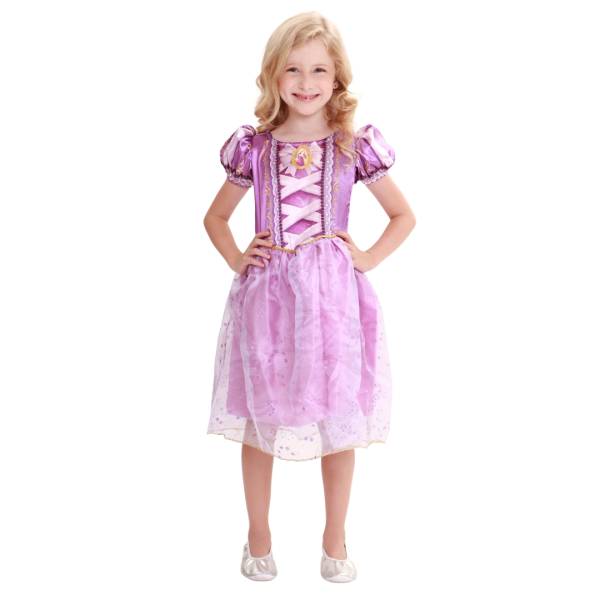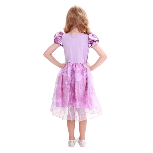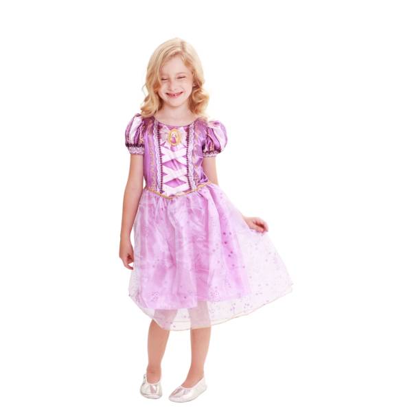 fantasia da personagem Rapunzel, uma das Princesas Disney, na versão clássica, vestido curto, mangas curtas, em luxuoso tecido 100% poliéster, disponível nos tamanhos P, M e G (3 a 5 anos, 6 a 8 anos e 9 a 12 anos recpectivamente).