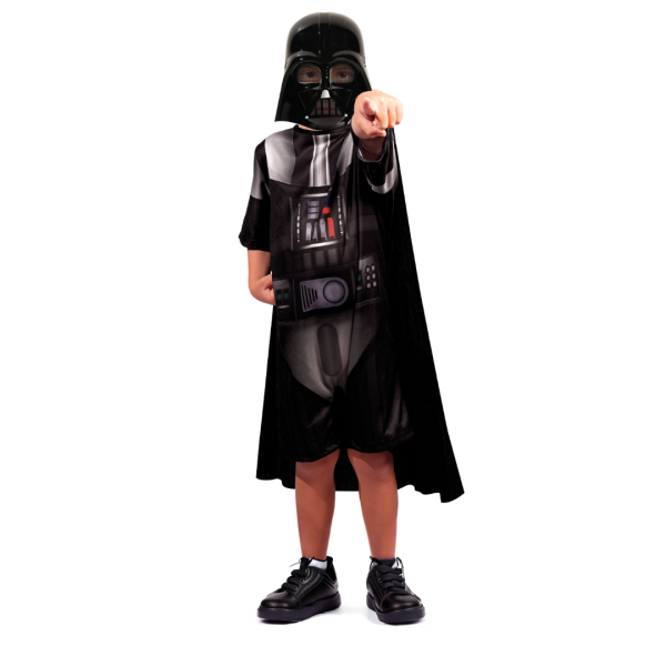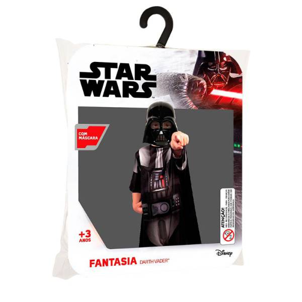 Fantasia do personagem Darth Vader, de Star Wars, macacão de pernas curtas e capa em tecido 100% poliéster, acompanha capacete injetado, disponível nos tamanhos P, M e G (3 a 5 anos, 6 a 8 anos e 9 a 12 anos recpectivamente).