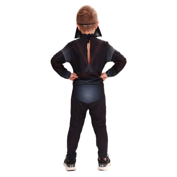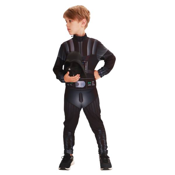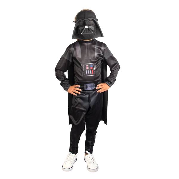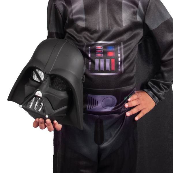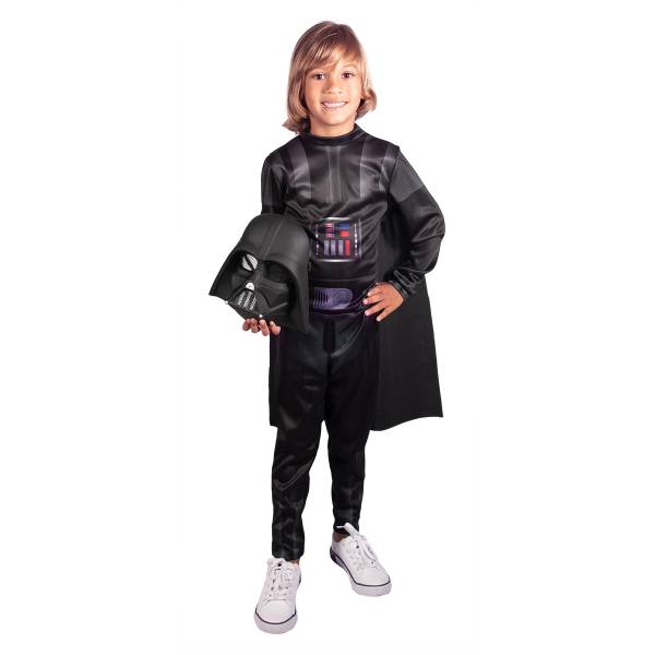 Fantasia do personagem Darth Vader, de Star Wars, macacão de pernas longas e capa em tecido 100% poliéster, acompanha capacete injetado, disponível nos tamanhos P, M e G (3 a 5 anos, 6 a 8 anos e 9 a 12 anos recpectivamente).