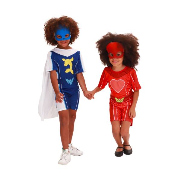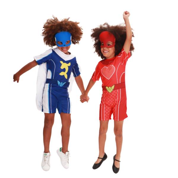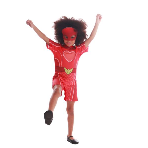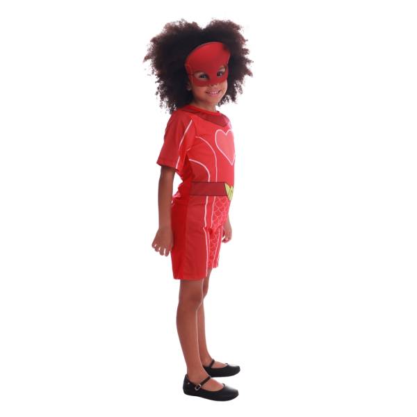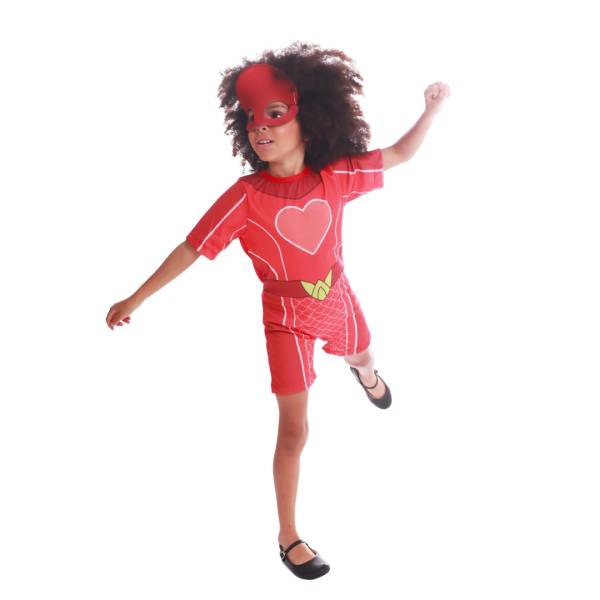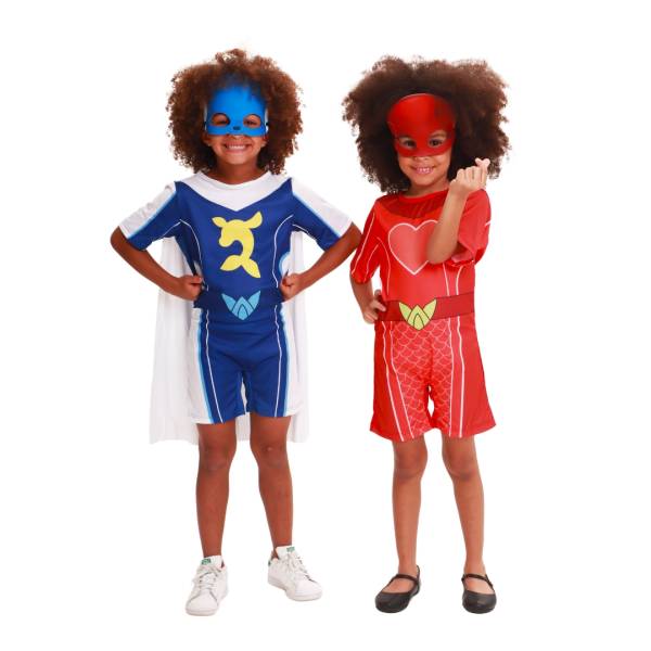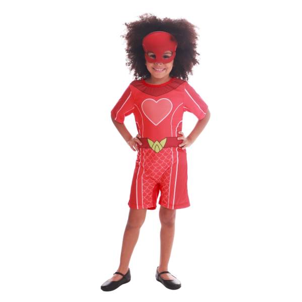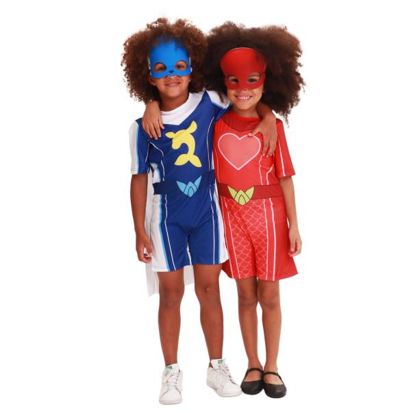 Fantasia da personagem Super Sereia, dos Aventureiros, Luccas Toon, macacão de pernas curtas e capa em tecido 100% poliéster, acompanha máscara em espuma anti chamas, disponível nos tamanhos P, M e G (3 a 5 anos, 6 a 8 anos e 9 a 12 anos recpectivamente).