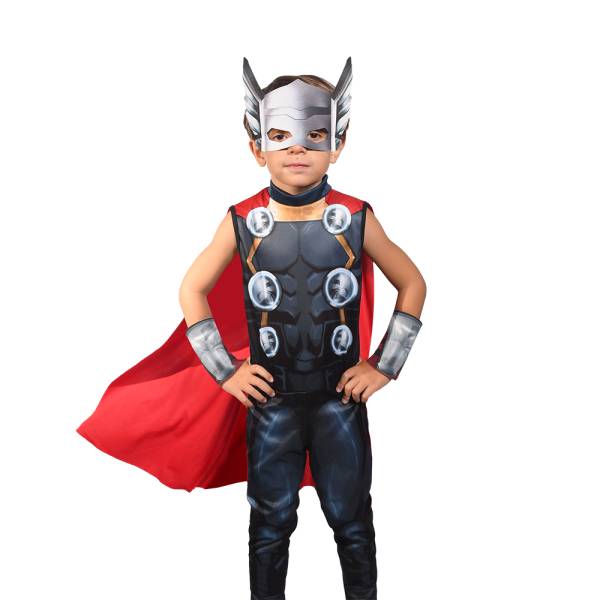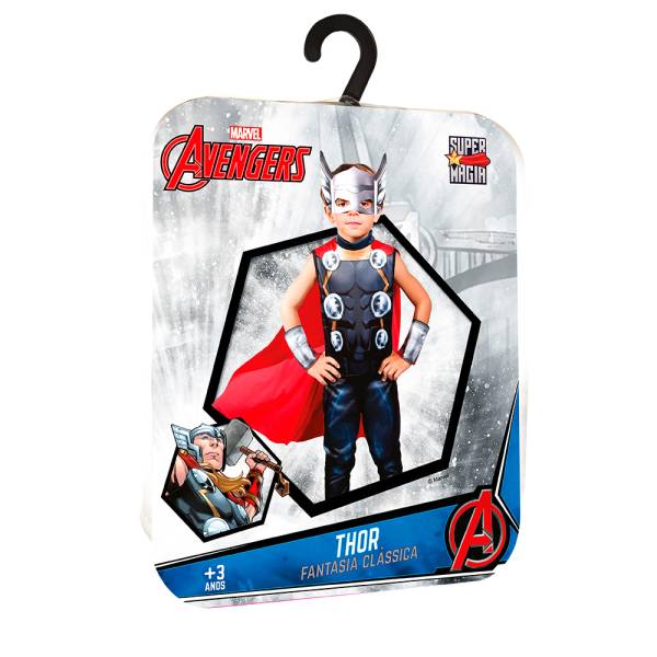Fantasia do Super Herói Avengers Thor, personagem da Marvel, versão clássica, macacão de pernas longas, sem manga, com capa e braceletes em tecido 100% poliéster, acompanha máscara em EVA, disponível nos tamanhos P, M e G (3 a 5 anos, 6 a 8 anos e 9 a 12 anos recpectivamente).