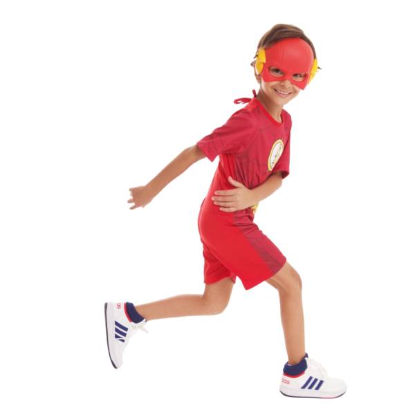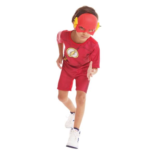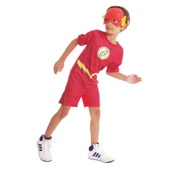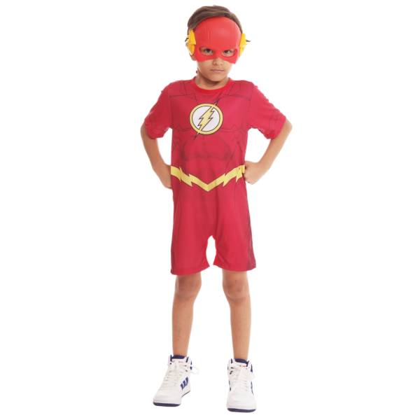 Fantasia do personagem Flash da Warner DC, macacão de pernas curtas em tecido 100% poliéster, acompanha máscara injetada, disponível nos tamanhos P, M e G (3 a 5 anos, 6 a 8 anos e 9 a 12 anos recpectivamente).