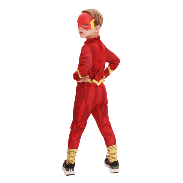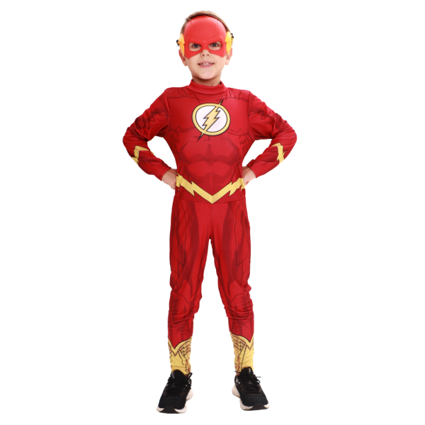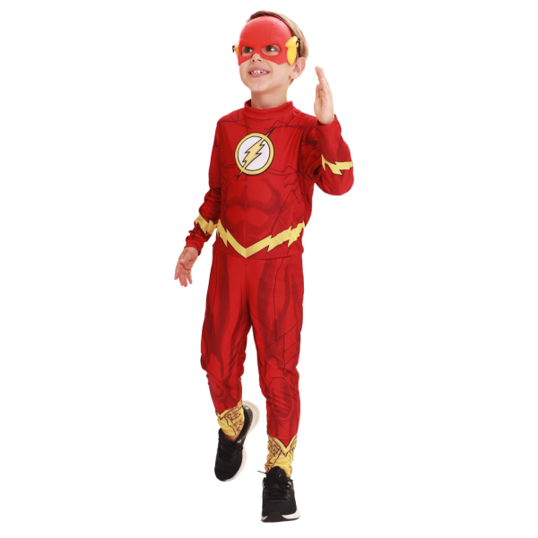 Fantasia do personagem Flash da Warner DC, macacão de pernas longas em tecido 100% poliéster, acompanha máscara injetada, disponível nos tamanhos P, M e G (3 a 5 anos, 6 a 8 anos e 9 a 12 anos recpectivamente).