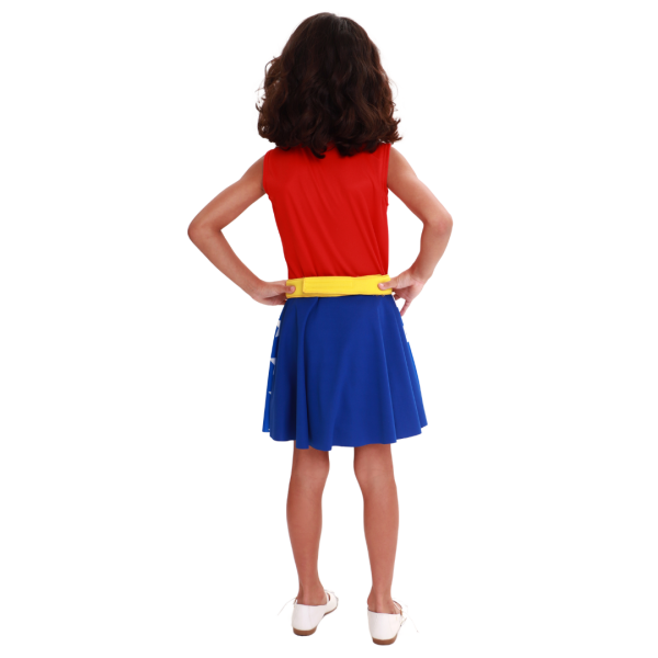 Fantasia da personagem Mulher Maravilha da Warner DC, vestido curto em tecido 100% poliéster, acompanha faixa para cabeça e cinturão, disponível nos tamanhos P, M e G (3 a 5 anos, 6 a 8 anos e 9 a 12 anos recpectivamente).